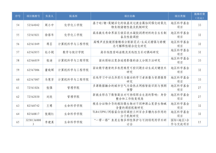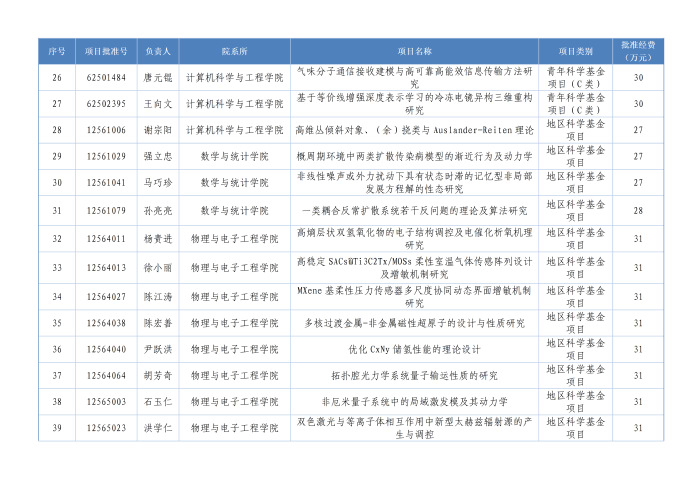 本年度获批项目分布于9个学院,分别是化学化工学院14项,物理与电子工程学院13项,数学与统计学院11项,生命科学学院10项,计算机科学与工程学院8项,地理与环境科学学院5项,管理学院2项,心理学院1项,旅游学院1项。